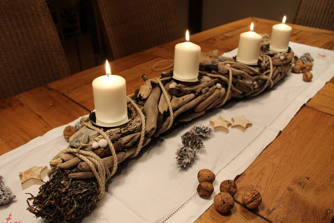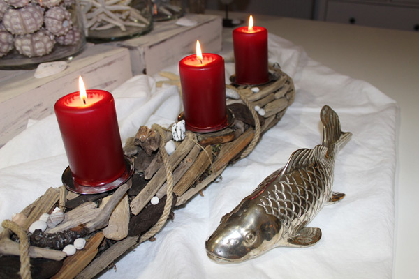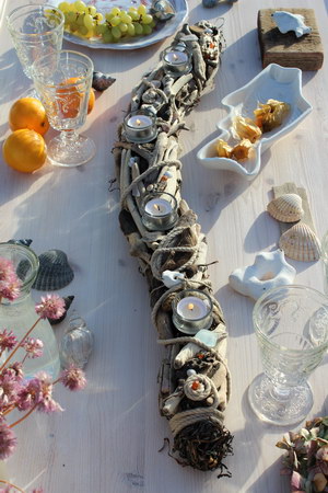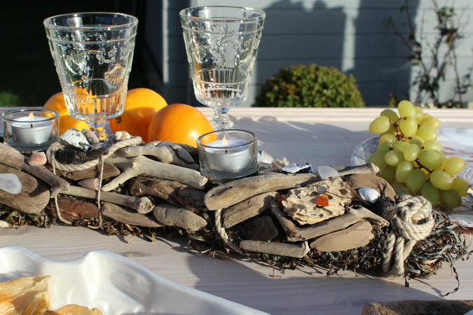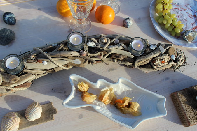 mit Seegras, Treibholz und vielen anderen Strandfunden, wie Seeglas, Kiesel und Bernstein, 4 Glaseinsätze mit Dorn, einfaches Entnehmen der Einsätze zum Reinigen oder zum Austausch gegen Kerzenteller zur Weihnachtszeit, ca. 95-100 cm lang, 10-12 cm Durchmesser