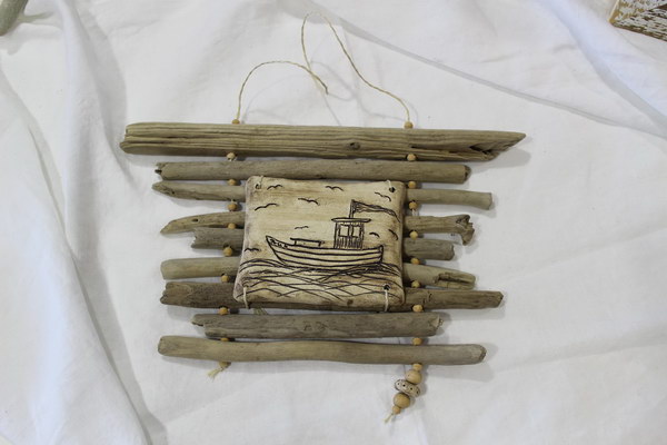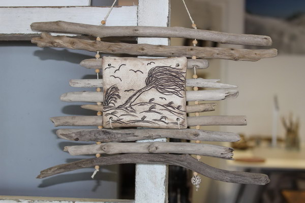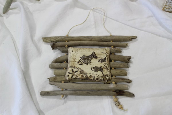 Geflecht aus Treibholz mit Keramik-Fisch oder Fliese,