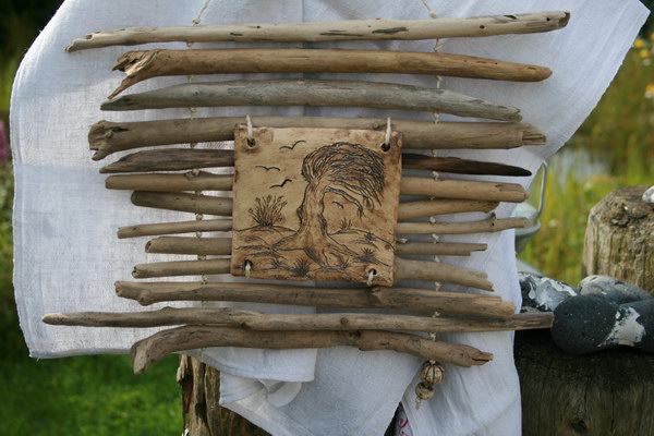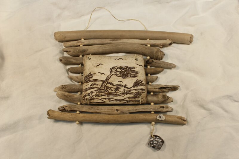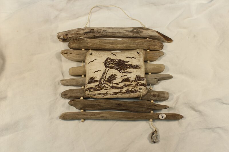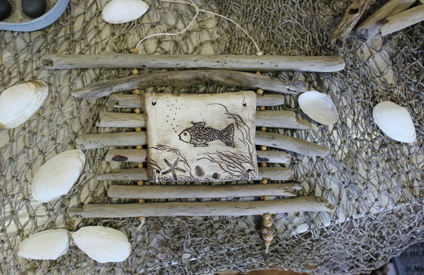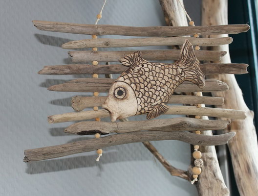 aus Treibholz, mit handgetöpferten Fischen aus Ton und schmiedeeisernen Haken