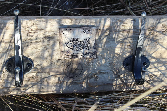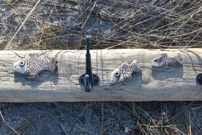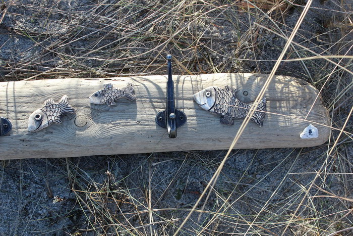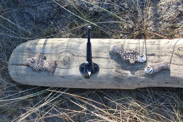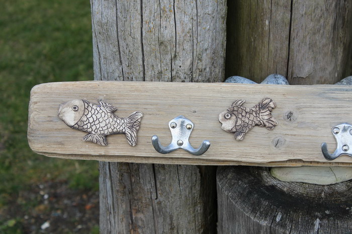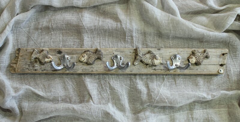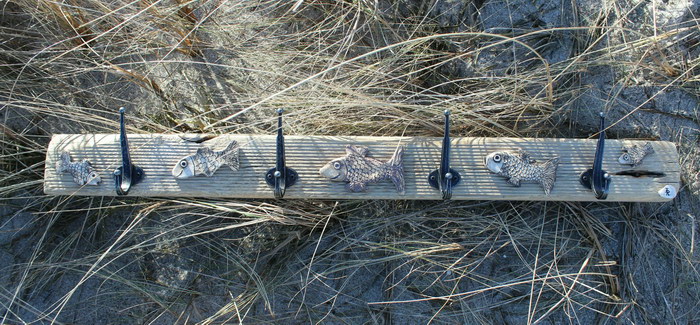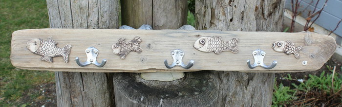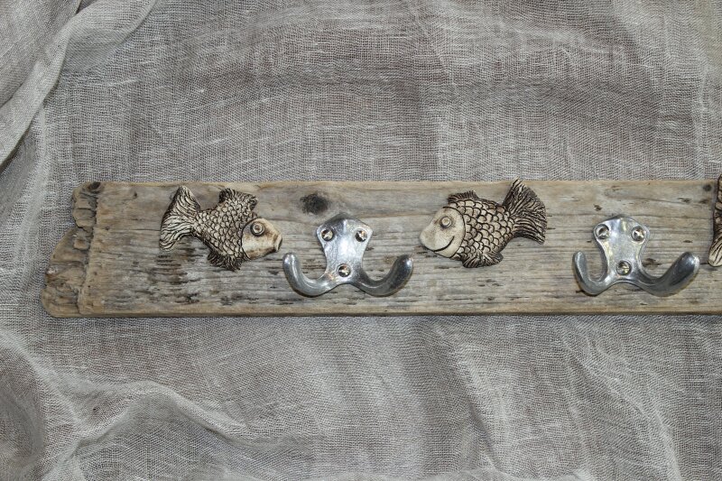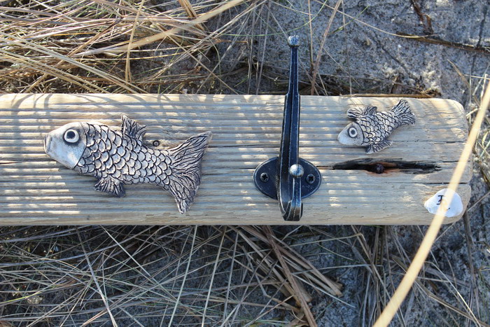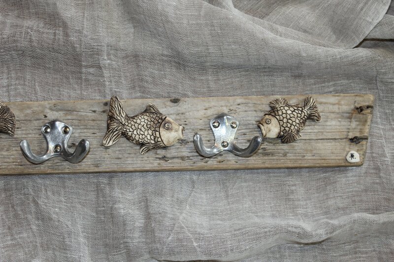 Garderobe ca. 80x10 cm (BxH), mit 3 Doppelhaken aus Aluminium, mit Fischen aus Ton[Artikel 33]