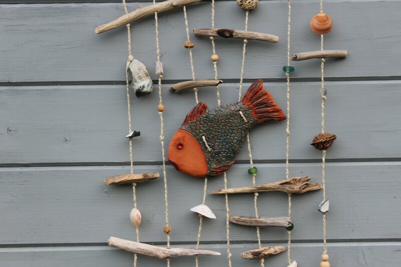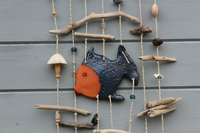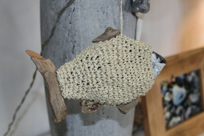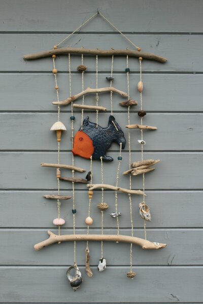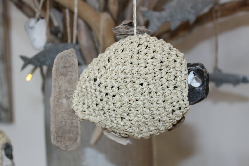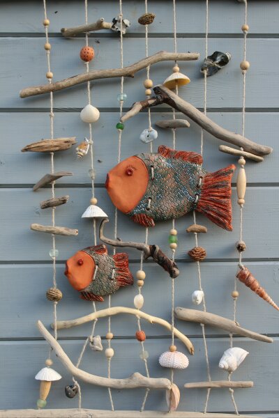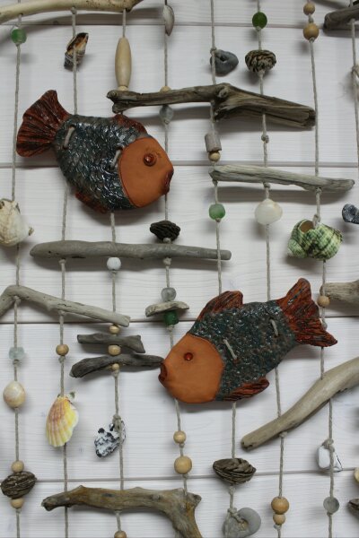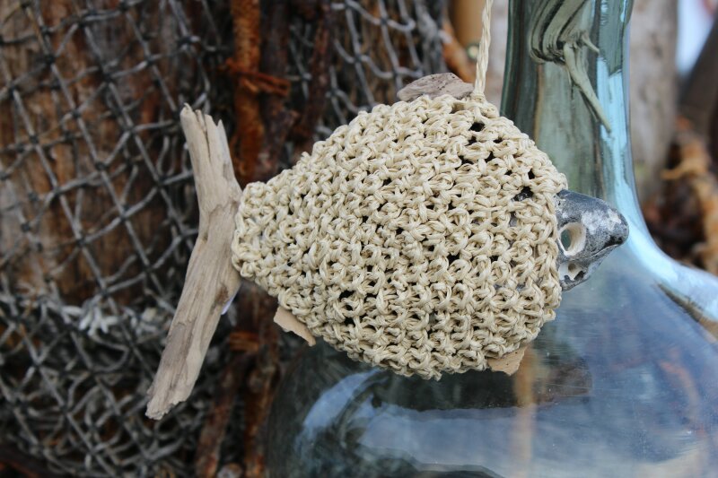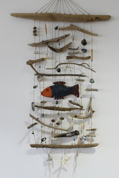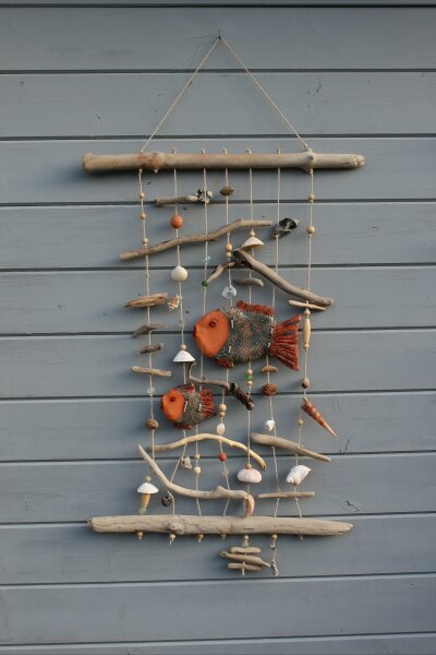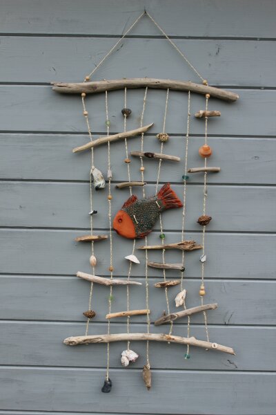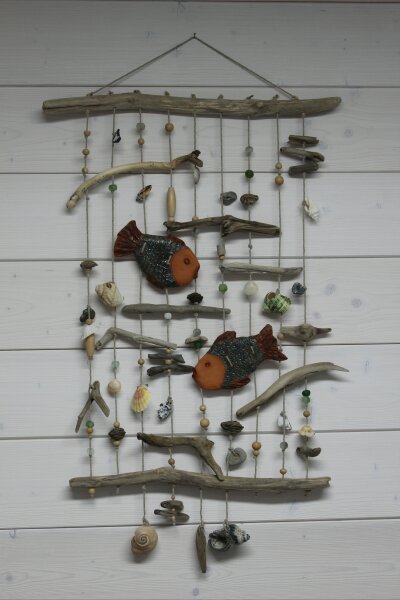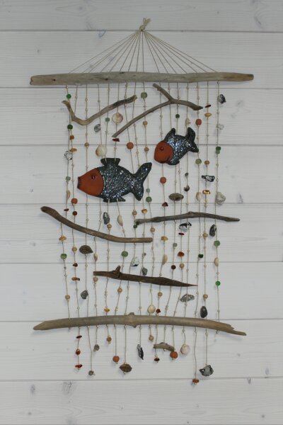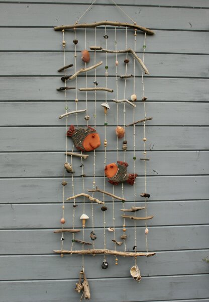 Seil und Seeglas hängende Deko für Fenster und Strauchwerk, mit Treibholz und Feuerstein, mit Seegras gefüllt, BxH 21x17 cm