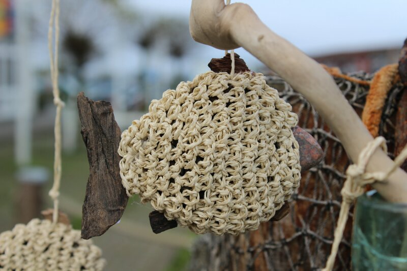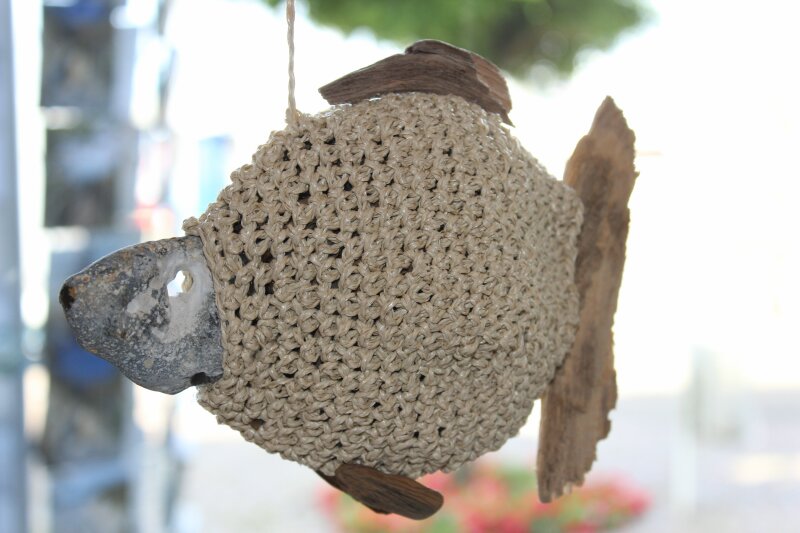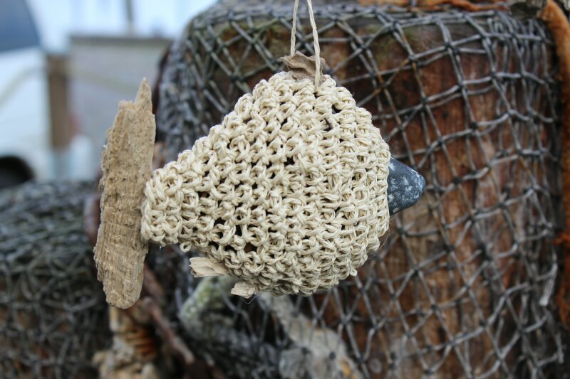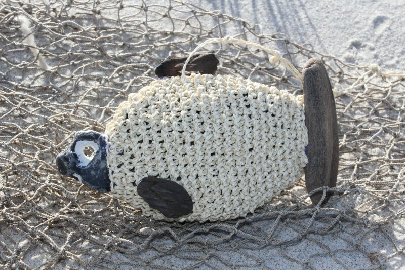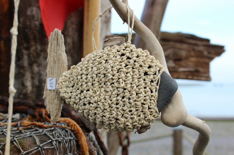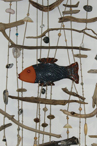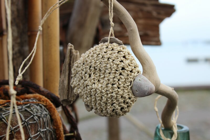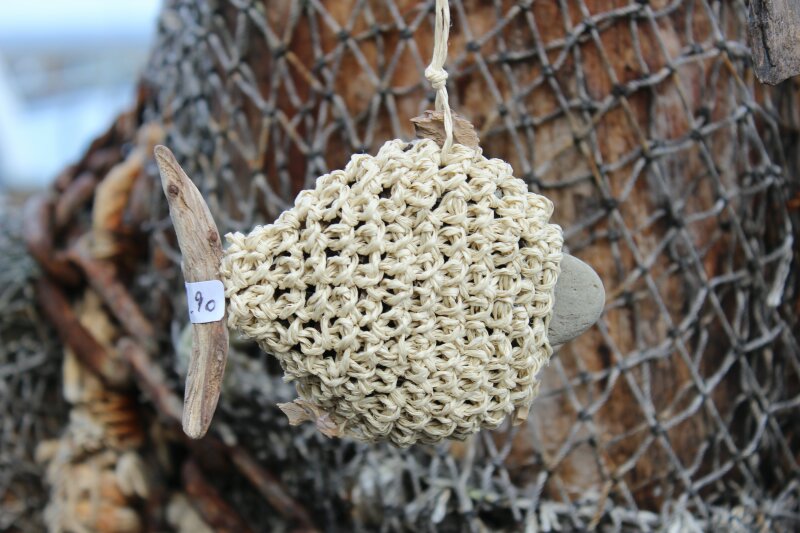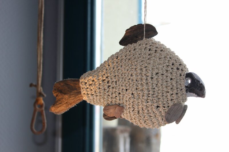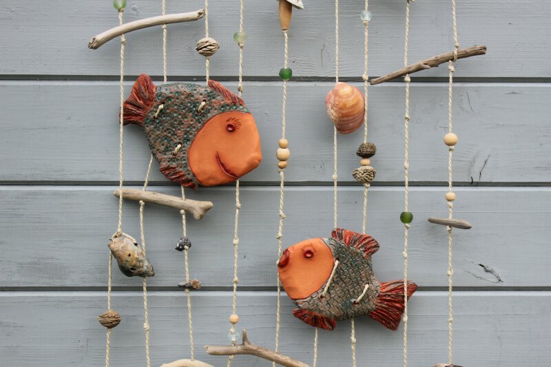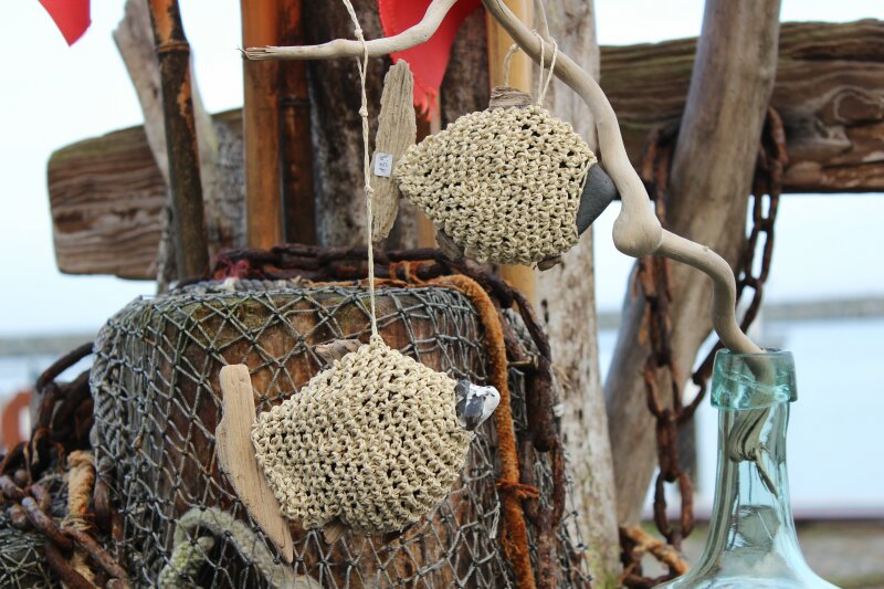 Seil und Seeglas hängende Deko für Fenster und Strauchwerk, mit Treibholz und Feuerstein, mit Seegras gefüllt, BxH 21x17 cm