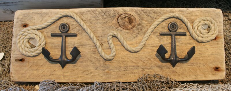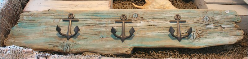 Garderobe aus Treibholz 54x18x3,5 cm, 2 schmiedeeiserne Wandhaken, Seil und Seeglas aus Treibholz, handbemalt, türkis ca. 99x19x2 cm, 3 schmiedeeiserne Wandhaken
